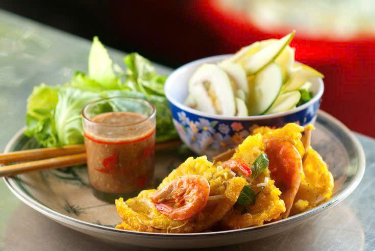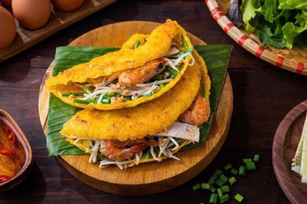 Bánh khoái là món ăn dân dã của Huế, tương tự bánh xèo nhưng nhỏ hơn, giòn rụm. Nhân bánh gồm tôm, thịt, giá đỗ, ăn kèm rau sống và chấm cùng nước lèo đặc trưng làm từ gan heo và đậu phộng.