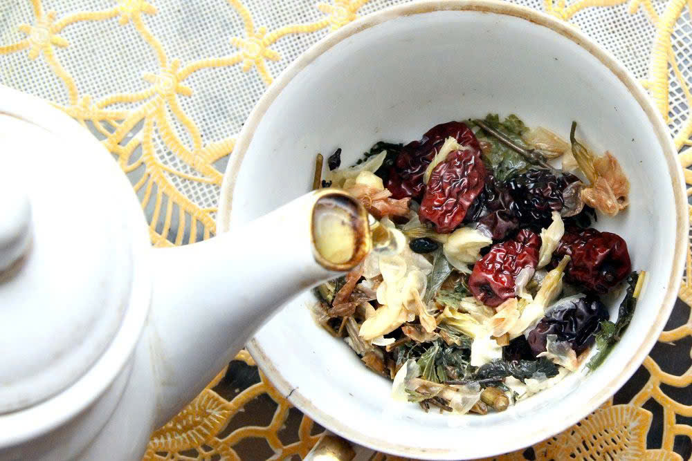 Trà cung đình Huế là thức uống thảo mộc cung đình xưa, pha chế từ nhiều loại dược liệu như atiso, cam thảo, hoa cúc, sen, táo đỏ… Vị ngọt thanh, thơm dịu, có tác dụng an thần, thanh lọc cơ thể.